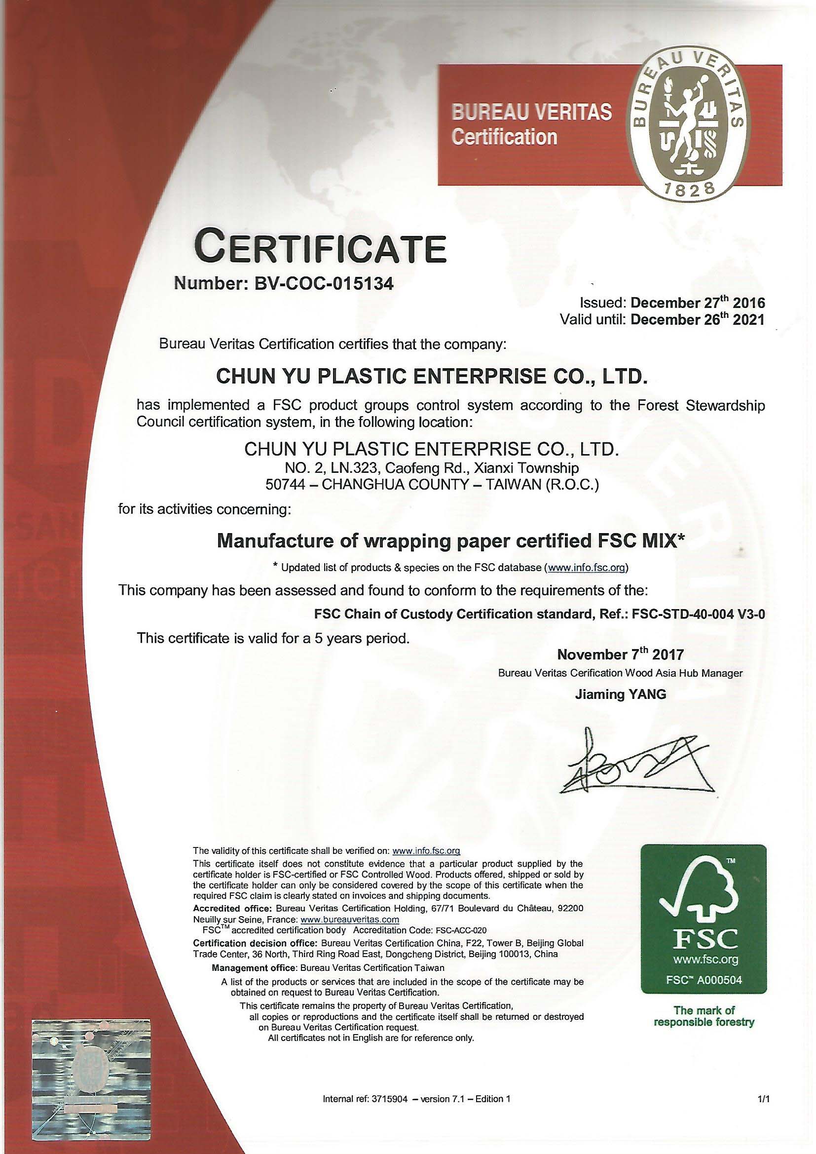2017/11/24 Chun YuTo protect our planet, Our company is FSC certified (FSC™ C108999). Our gift wrapping paper is made of well-managed FSC™-certified forests and other controlled material. Our customers could enjoy the gift wrapping pleasure without harming our environment. Come to check our earth-caring wrapping paper.